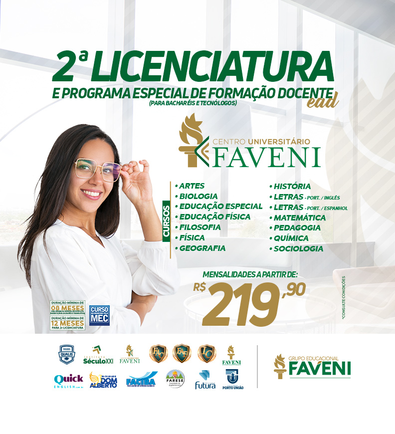 O GRUPO EDUCACIONAL FAVENI é dirigido pelo Empreendedor e Educador Leandro Xavier Timóteo. Com uma vasta experiência, atuando no segmento educacional com mais de 200 mil alunos e 100 polos espalhados em todo o Brasil. Ofertando ensino de qualidade reconhecido pelo Ministério da Educação (MEC).